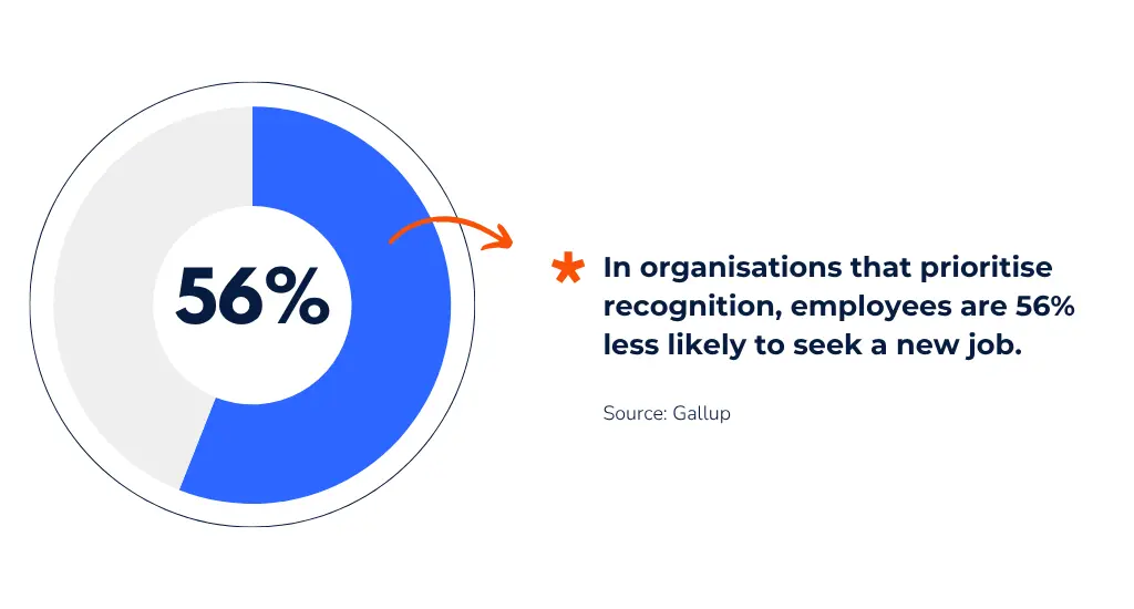 - In organisations that prioritise recognition, employees are 56% less likely to seek a new job. (Gallup)