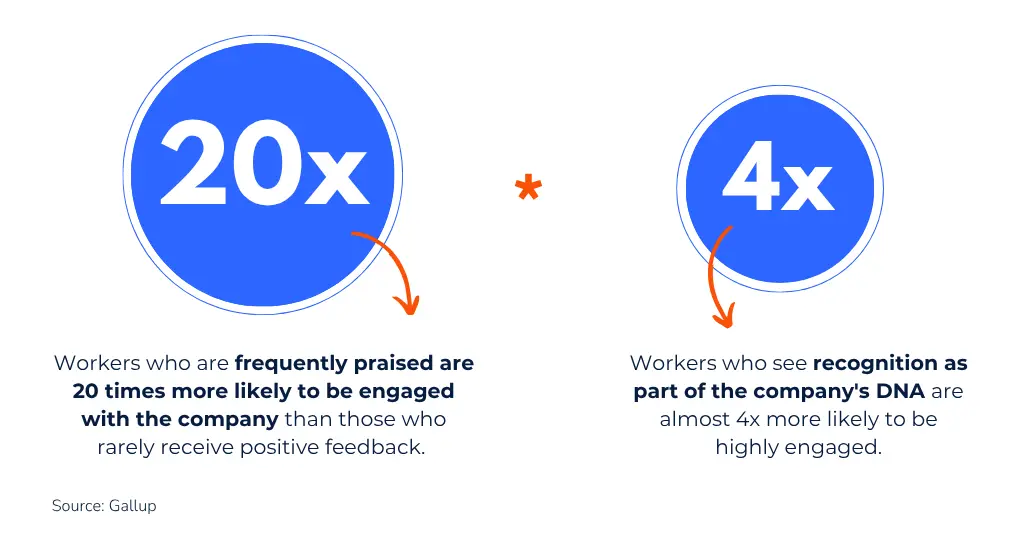 - Workers who are frequently praised or recognized are 20 times more likely to be engaged with the company than those who rarely receive positive feedback. (Gallup)