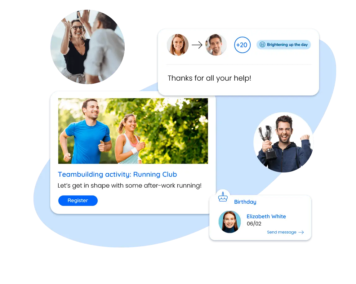 A hub for employee connection and appreciation. Employees show their gratitude, recognition and appreciation for each other, award each other points and give positive feedback to colleagues across the company. A real, positive impact on employee motivation and the company work climate.