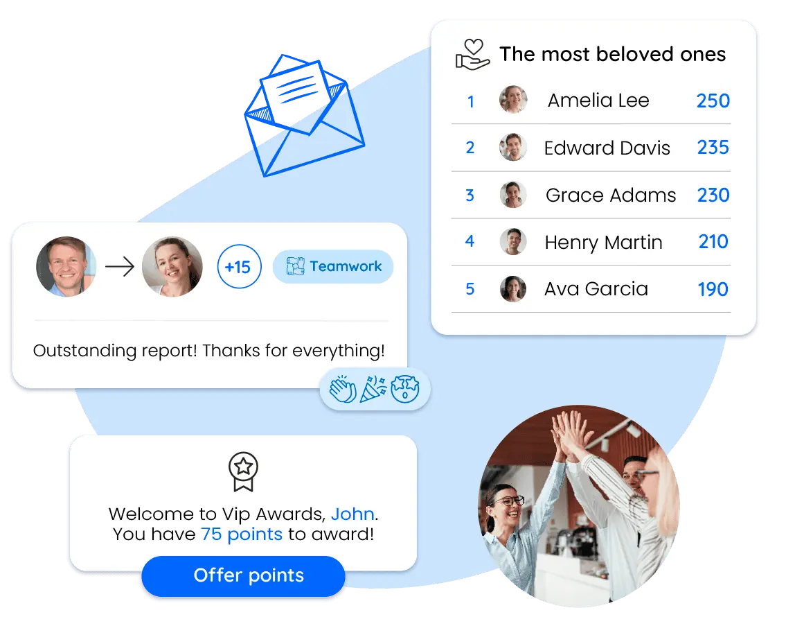 Os colaboradores atribuem pontos e enviam feedback positivo e mensagens de aos seus colegas, independentemente do local ou do escritório. Desde um “muito obrigado” a um elogio genuíno e sentido.Os colaboradores sentir-se-ão reconhecidos e valorizados pelo seu trabalho e esforço, não só pelos seus chefes, mas também pelos seus pares.